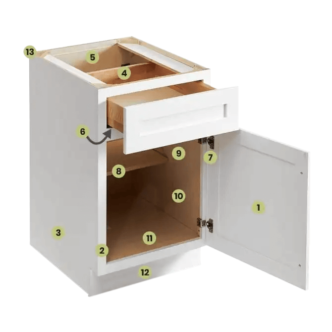 1. 3/4” thick solid hardwood doors and drawer fronts, with engineered center panel for a quality look and feel.